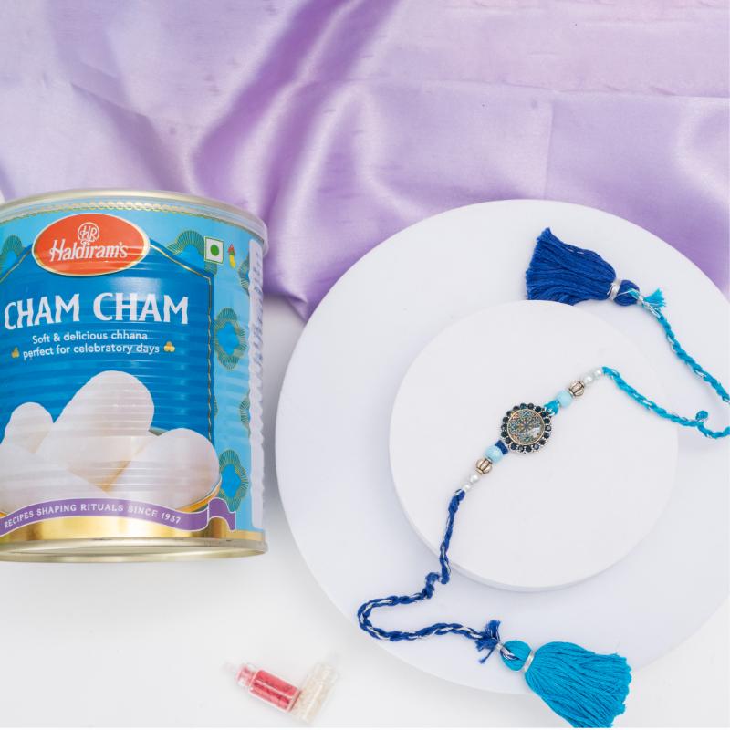 Adorn your brother''s wrist with our Aqua Luxe Rakhi, a truly unique and modern piece featuring a stunning, polished blue stone at its heart. This contemporary design is beautifully accented with a stylish tassel, adding a touch of sophistication and flair. More than just a thread, this rakhi embodies tranquility, depth, and the cool confidence of your bond, making it a distinctive and memorable symbol of your affection. This elegant rakhi comes paired with a generous 1kg of juicy, spongy Cham Cham, a beloved Indian sweet that promises to add an extra layer of sweetness to your Raksha Bandhan celebrations. It''s the perfect blend of unique, modern design and traditional indulgence.