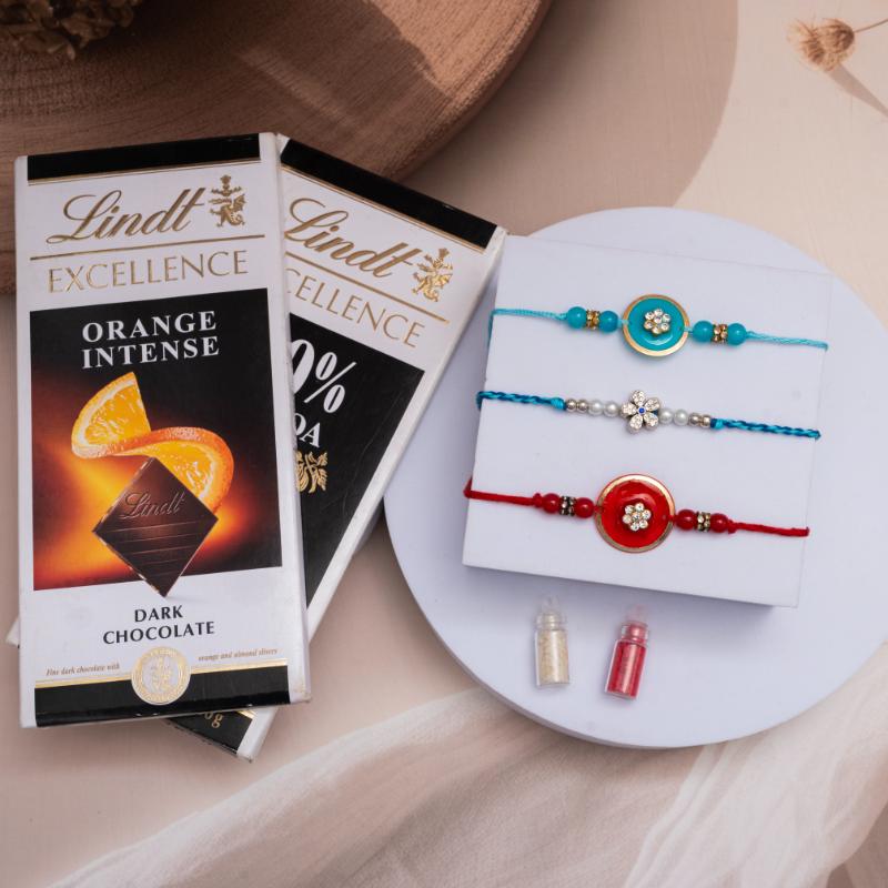 Celebrate sibling love with a touch of modern elegance through this stunning set of 3 artistic rakhis, each handcrafted with contemporary flair. Paired with 2 premium Lindt Excellence chocolate bars, this gift brings together tradition, style, and indulgence. It''s a perfect Raksha Bandhan gift for brothers who appreciate both design and deliciousness. Thoughtfully packed for a memorable unboxing experience, this set is ideal for sending warmth across the miles.