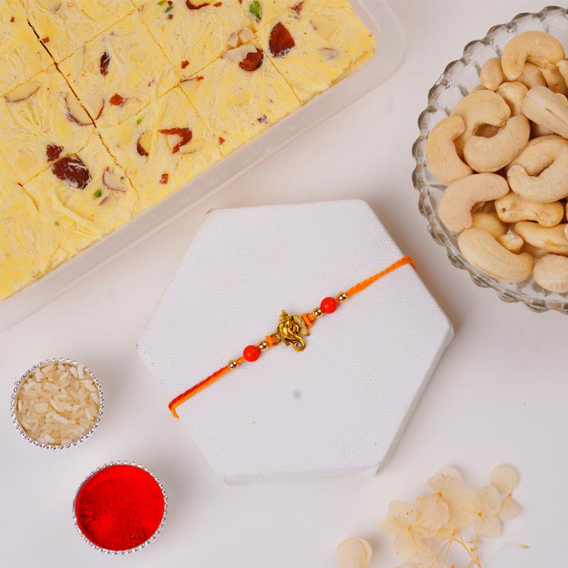 Celebrate the blessings of Lord Ganesha and the sweetness of sibling love with this Golden Ganesha Rakhi with Soan Papdi 250gm and Cashew 100gm combo. The rakhi features a radiant Ganesha motif symbolizing wisdom, protection, and prosperity. Paired with classic Indian soan papdi and premium-quality cashews, this set offers the perfect blend of tradition, flavor, and festivity—ideal for gifting or sending rakhi to the USA.