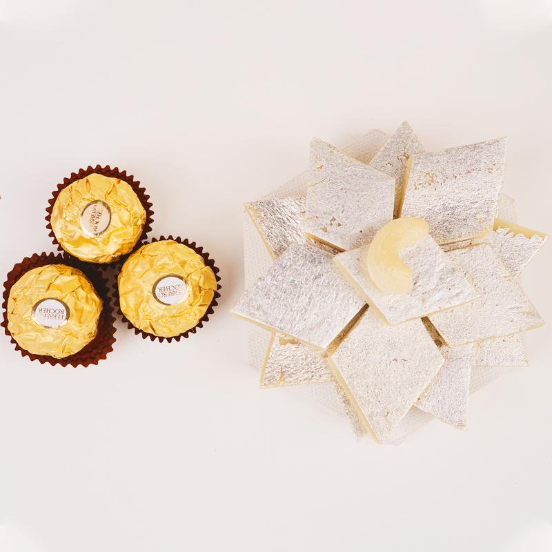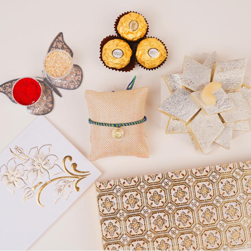 Adorn your brother''s wrist with our Auspicious Coin Om Rakhi, a truly unique piece that blends traditional spirituality with a touch of classic charm. This distinctive rakhi features a beautifully crafted ''Om'' symbol embedded within a coin-like medallion, symbolizing peace, prosperity, and good fortune. It''s more than just a thread; it''s a profound blessing for his well-being and a unique token of your enduring bond. This sacred rakhi comes perfectly paired with 200gms of rich, melt-in-your-mouth Kaju Katli, a beloved traditional sweet, and three exquisite Ferrero Rocher chocolates, adding a touch of gourmet indulgence to your heartfelt Raksha Bandhan celebrations.