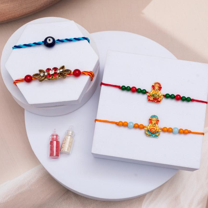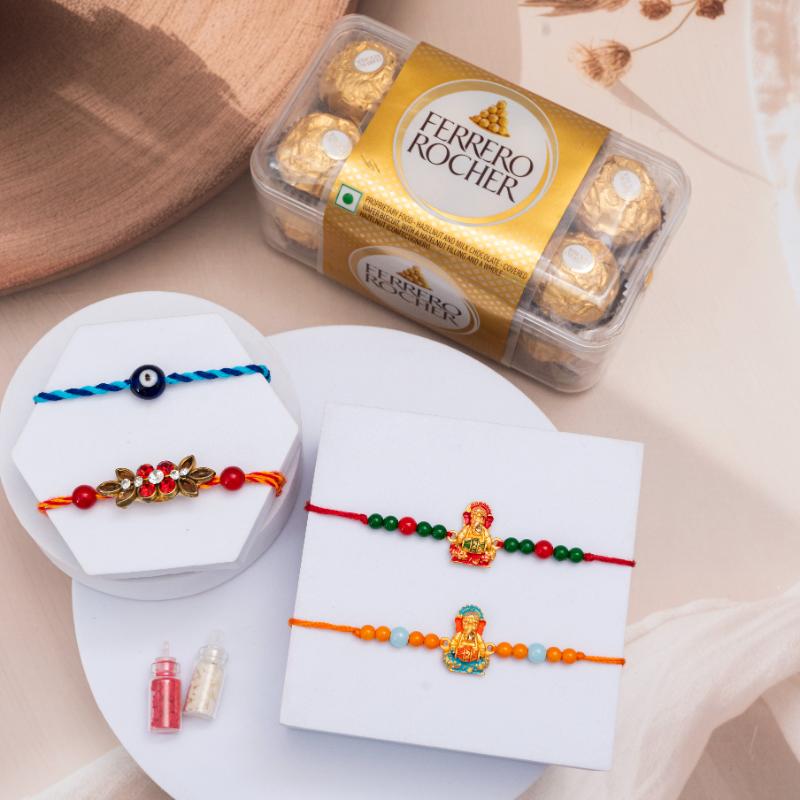 Add divine blessings, protective energy, and sweet indulgence to your Raksha Bandhan celebration with this thoughtfully curated Set of 4 Rakhis. It includes two spiritual Ganesha rakhis, a blue evil eye rakhi to ward off negativity, and a graceful stone rakhi—paired with a box of 12 Ferrero Rocher chocolates. A perfect mix of tradition, care, and gourmet delight for your beloved brothers.