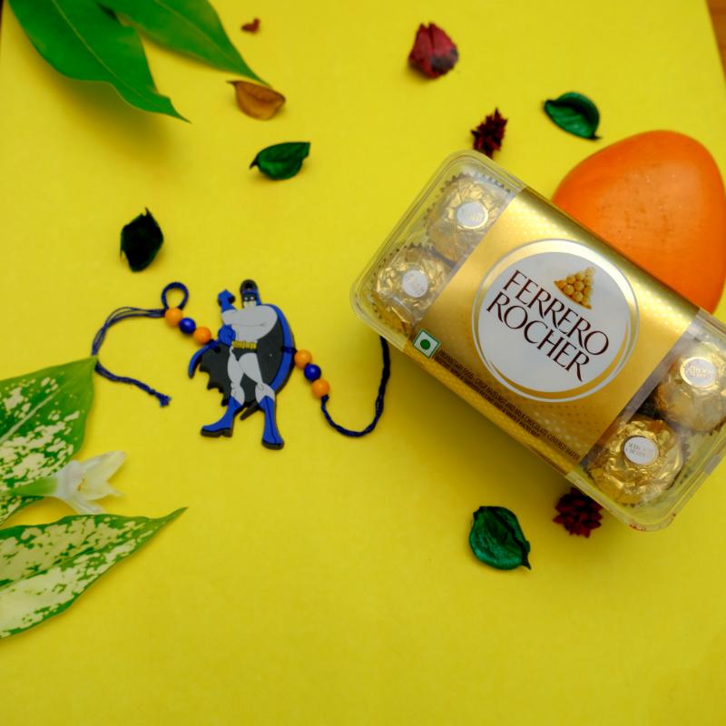 Celebrate your brother''s quiet heroism this Raksha Bandhan with a powerful Batman Rakhi paired with a luxurious box of 16 Ferrero Rocher chocolates. Perfect for the sibling who protects like a superhero and deserves to be spoiled like one too—this combo is all about strength, sweetness, and sibling love.
