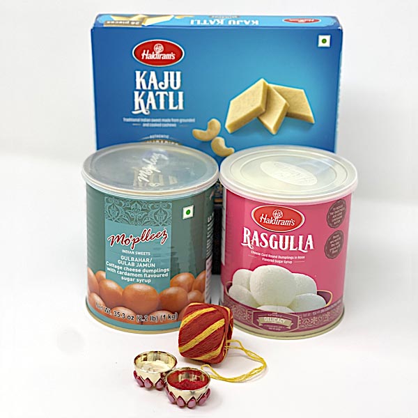 Kaju Katli 200gm Rasgulla 1Kg Gulabjamun 1Kg Kalava and Roli Tika