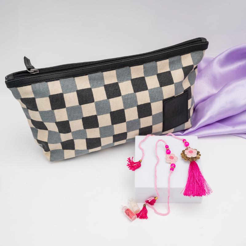 Celebrate the sweet bloom of your bond with our Blooming Affection & Travel Ready Rakhi set! This delightful Bhaiya Bhabhi Rakhi features intricate pink floral designs, symbolizing grace, love, and growth. The delicate blossoms on the Bhaiya Rakhi are perfectly complemented by the matching Lumba for Bhabhi, creating a truly charming and elegant pair. Adding a thoughtful and practical touch, this set includes a versatile travel pouch. It''s perfect for your Bhaiya and Bhabhi to organize their essentials, making their journeys smoother and more stylish. This Rakhi set is a beautiful blend of artistic charm and modern utility, ensuring their Raksha Bandhan is both heartfelt and practical.