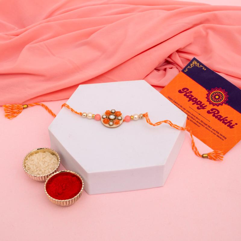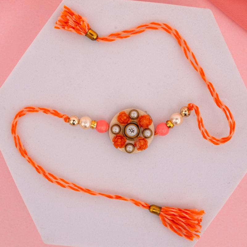 Brighten your brother’s wrist with the cheerful charm of our Blossom Bond Floral Orange Rakhi. Featuring a delicate floral design at the center, this rakhi is beautifully accented with radiant orange beads and matching thread—symbolizing warmth, positivity, and new beginnings. It’s the perfect choice for a brother who brings sunshine into your life. Celebrate your bond with a rakhi that’s light, joyful, and full of vibrant energy—just like your sibling relationship.