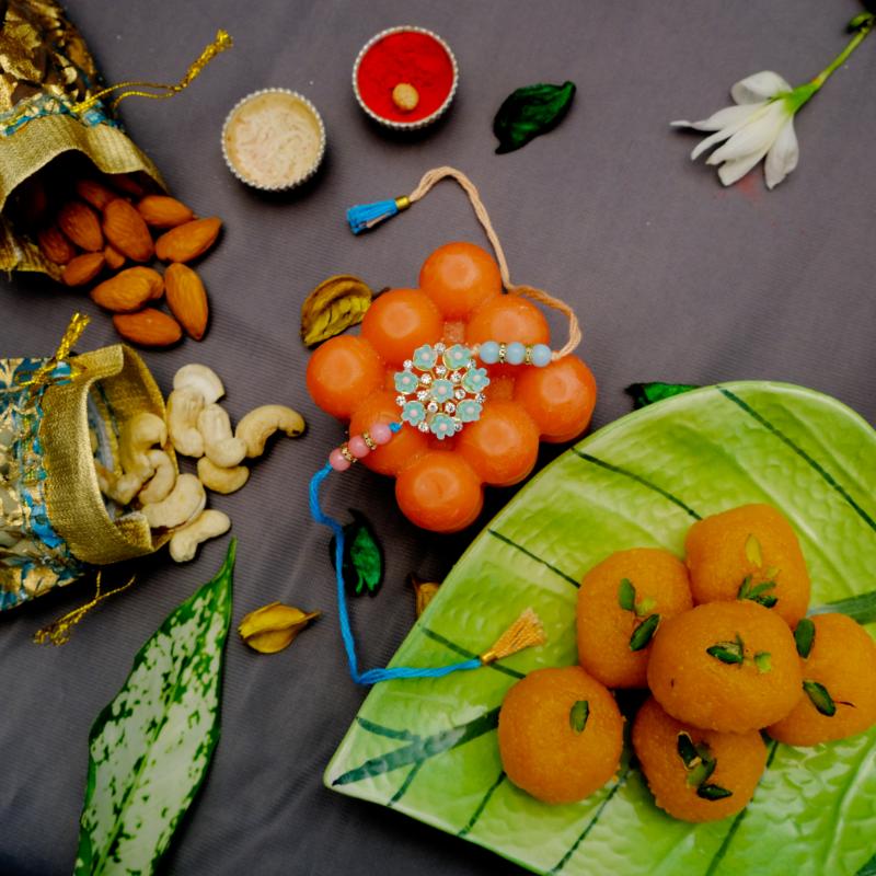 Celebrate Raksha Bandhan with elegance and flavor through this Floral Rakhi with Cashew 100gm, Almonds 100gm & Motichoor Laddu 340gm. The rakhi features a beautifully crafted floral design that symbolizes love, growth, and warmth. Paired with premium almonds and cashews and a box of soft, melt-in-the-mouth motichoor laddus, this combo is the perfect blend of tradition, health, and sweetness—ideal for gifting or sending rakhi to the USA.