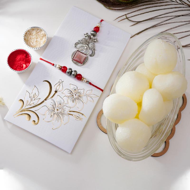 Adorn your cherished Bhaiya and Bhabhi this Raksha Bandhan with our Blush Kundan & Sweet Rasogolla Rakhi set! This exquisite pair showcases the timeless beauty of delicate pink Kundan stones, meticulously set within intricate oxidized metal designs. The soft pink hue symbolizes affection, tenderness, and enduring love, perfectly complementing the rustic charm of the oxidized finish. The Bhaiya Rakhi features a robust and elegant design, while the accompanying Lumba for Bhabhi dangles gracefully, echoing the same artisanal craftsmanship. To sweeten their celebration, we’ve included a generous 1kg of delectable Rasogolla, ensuring an abundance of traditional Indian sweetness. It’s a magnificent gift, blending traditional artistry with delightful treats for an unforgettable and truly sweet Raksha Bandhan.