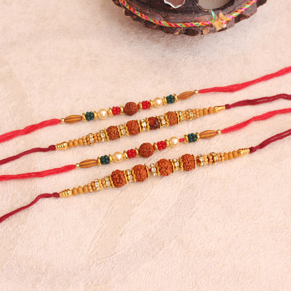 Celebrate the joyous festival of Raksha Bandhan with this perfect set of 4 Rakhis. Beautifully crafted using colorful beads, Rudraksha beads and soft threads, these are an exclusive collection only for your brothers. The unique pattern of Rudraksha Beads will leave your dotting brothers amazed when they will tie it on their wrist.