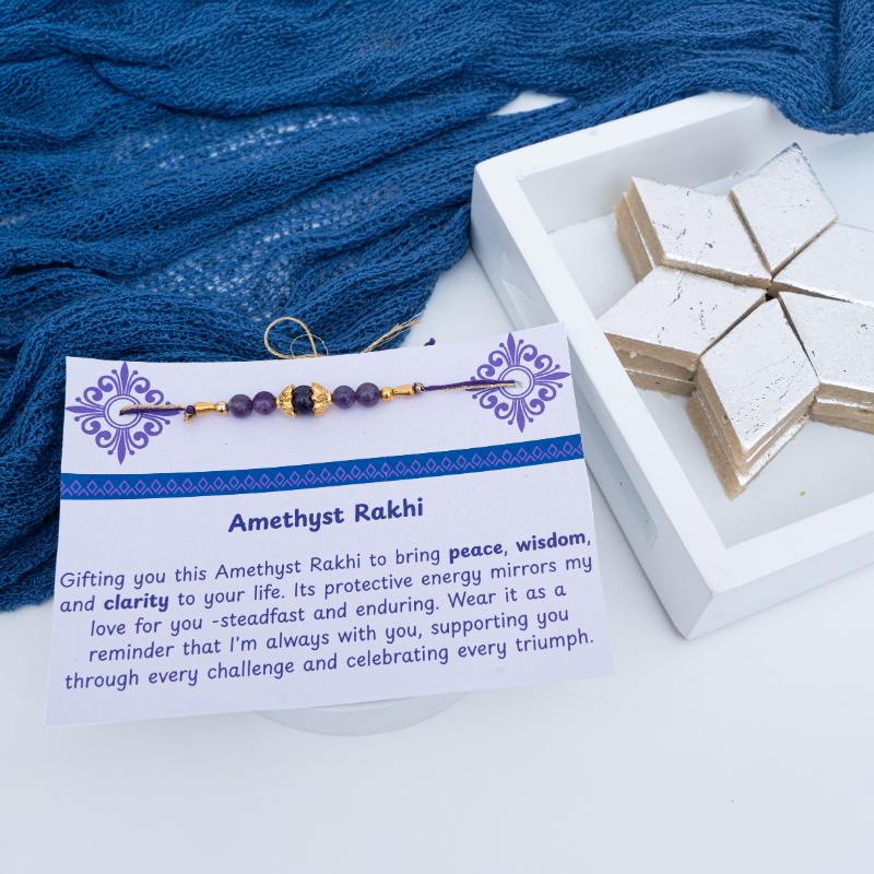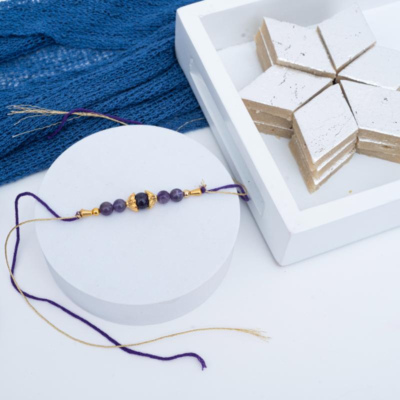 Adorn your brother''s wrist with our Calming Amethyst Rakhi, a truly unique piece featuring a genuine, natural amethyst crystal. Known for its soothing energy and protective qualities, this beautiful purple stone symbolizes peace, clarity, and spiritual well-being—making it more than just a rakhi, but a thoughtful talisman for his journey. This distinctive thread combines natural beauty with heartfelt blessings, designed to stand out and offer positive vibrations. Perfectly paired with 200gms of rich, melt-in-your-mouth Kaju Katli, this gift set offers a delightful blend of serene energy and traditional sweetness for a truly special Raksha Bandhan.