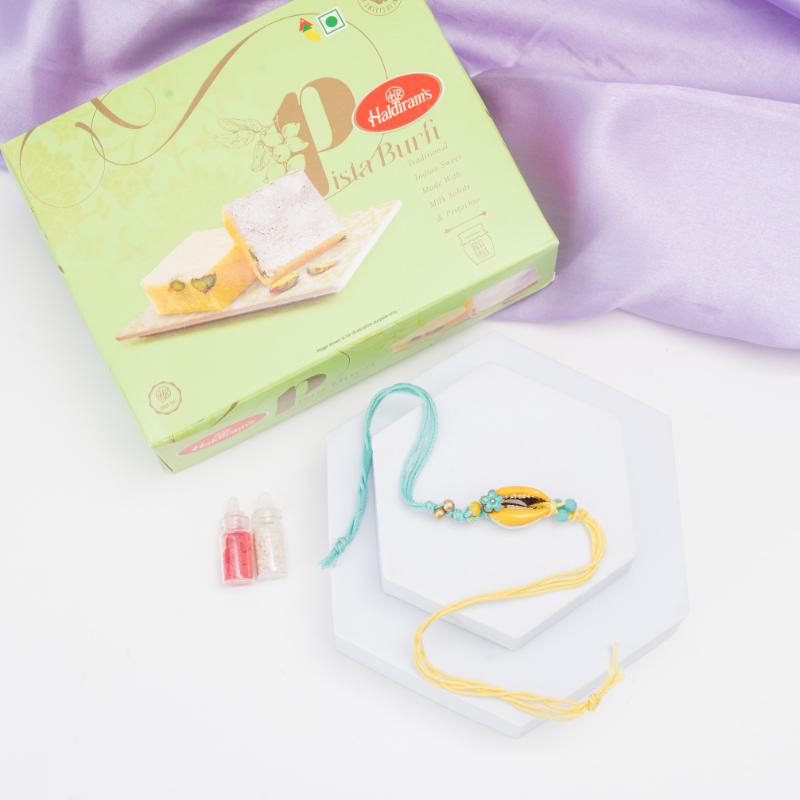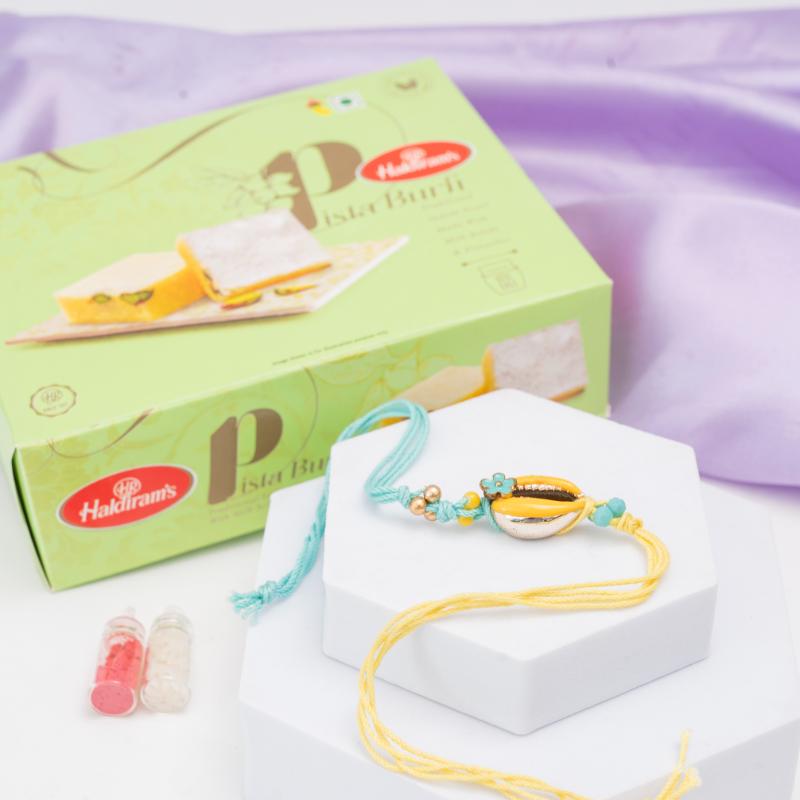 Adorn your brother''s wrist with our Coastal Sunshine Rakhi, a truly unique piece that captures the essence of serene shores. This distinctive rakhi features a delicate yellow shell, symbolizing protection, resilience, and the comforting rhythm of the ocean. It''s more than just a thread; it''s a heartfelt wish for calm and prosperity, embodying a subtle, natural elegance. This charming token of your affection comes perfectly paired with 340gms of rich, melt-in-your-mouth Pista Burfi, a delightful sweet bursting with the nutty flavor of pistachios, adding a refreshing touch to your heartfelt Raksha Bandhan celebrations.