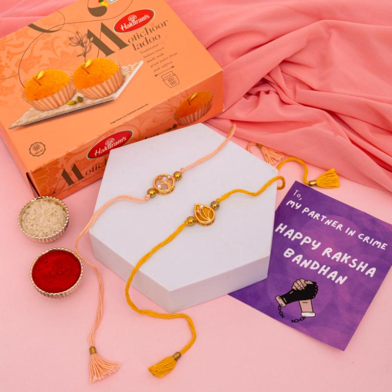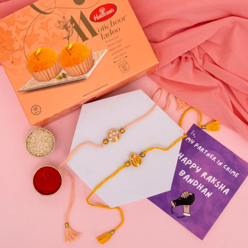 Adorn your brother''s wrist with our Contemporary Stone Work Rakhi, a unique piece that beautifully merges modern design with traditional sentiment. This exquisite rakhi features intricate stone embellishments set in a sleek, contemporary pattern, symbolizing strength, clarity, and the enduring bond you share. It''s more than just a thread; it''s a stylish statement of your affection, designed to be both meaningful and visually striking. This distinctive rakhi comes perfectly paired with 340gms of rich, melt-in-your-mouth Motichoor Laddus, a beloved traditional sweet that promises a burst of delightful flavor to his Raksha Bandhan celebration.