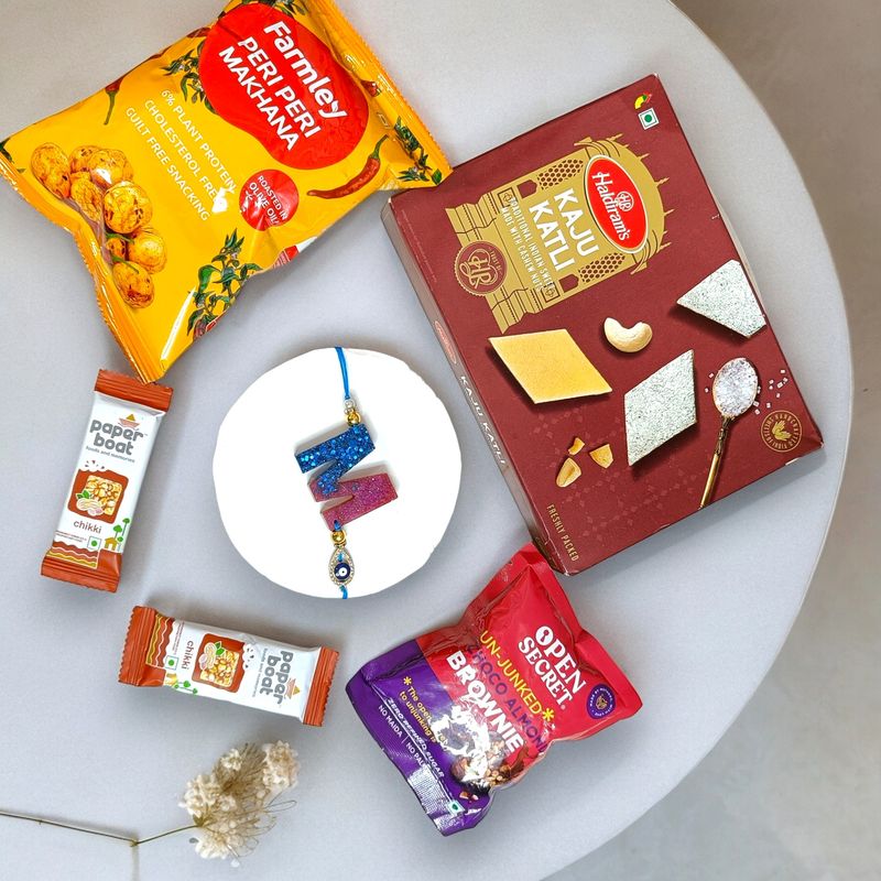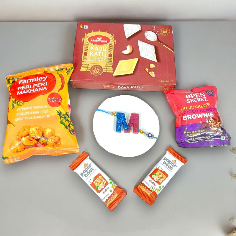 Celebrate the bonds of love and tradition with our exquisitely crafted Personalised Initial Alphabet Rakhi, designed to make your festive occasion truly special. This unique rakhi features a charming initial that beautifully represents your bond with your brother, symbolizing not just affection but also a connection steeped in personal sentiment. Accompanying this thoughtful gesture are delectable indulgences: two delightful paperboat chikkis, each bursting with the wholesome goodness of traditional ingredients; 200gms of rich, velvety kaju katli that melts in your mouth; an irresistibly fudgy Open Secret brownie that offers a modern twist to traditional sweets; and crunchy, healthy Farmley makhanas, perfect for guilt-free snacking. This rakhi set is not just a celebration of sibling love but also a delightful assortment of treats that will make your festivities memorable and joyous. Elevate your Raksha Bandhan with this customized gift that speaks volumes of your affection and care.