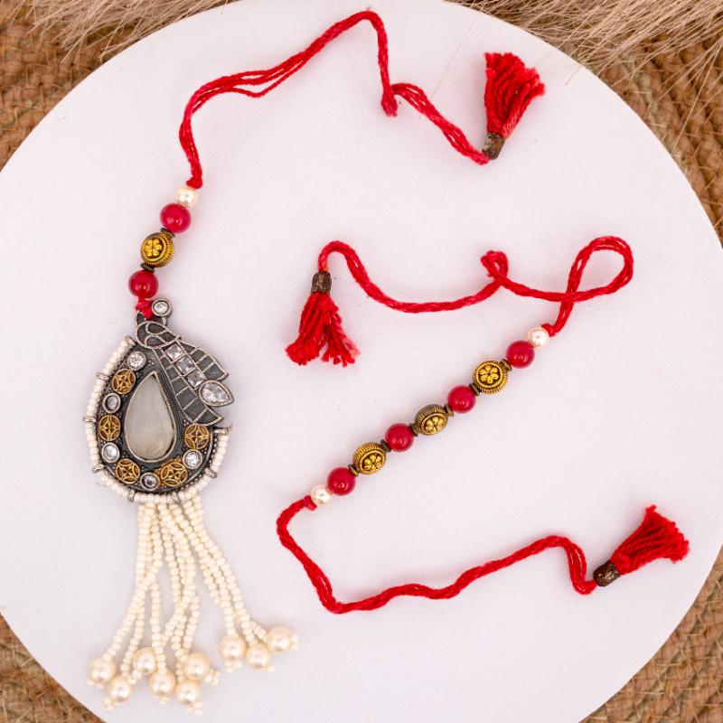 Celebrate the unbreakable bond with our Crimson Glow Milky Stone Rakhi Pair. This exquisite Bhaiya Bhabhi Rakhi features captivating milky white stones beautifully set on vibrant red threads, symbolizing purity, passion, and enduring love. The Bhaiya Rakhi boasts a sophisticated design, while the accompanying Lumba for Bhabhi elegantly mirrors its charm, creating a harmonious pair. Each stone radiates a subtle glow, making this set a truly unique expression of affection. It''s a perfect blend of elegance and tradition for a heartfelt Raksha Bandhan.