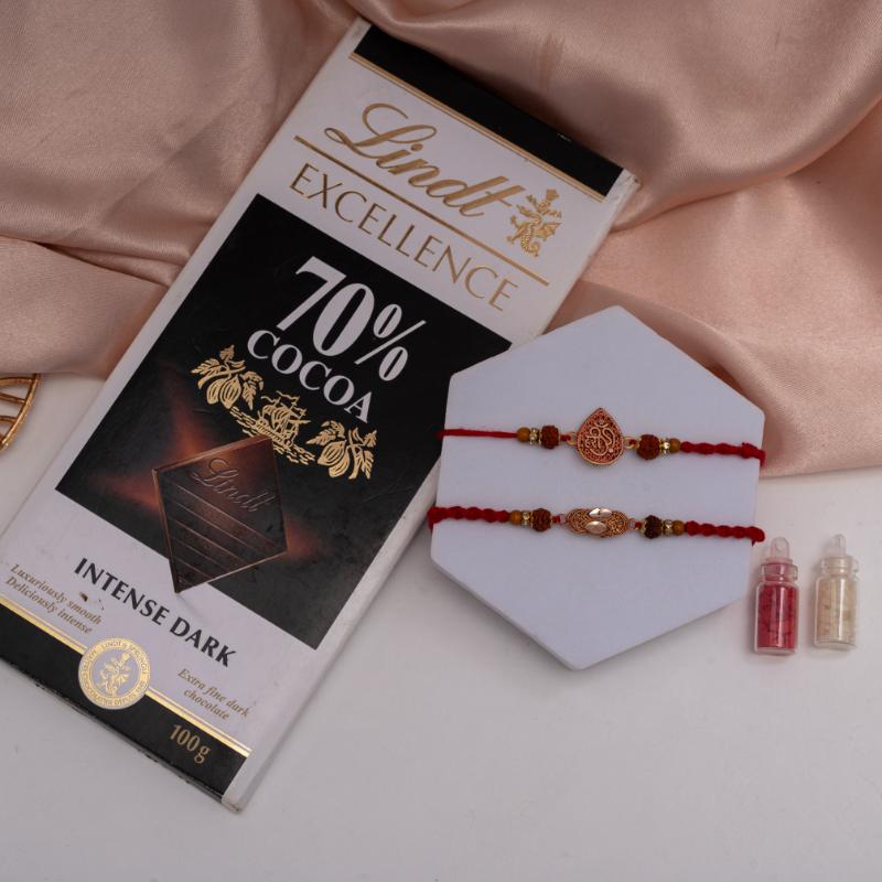 Celebrate Raksha Bandhan with a harmonious blend of spiritual sentiment and sophisticated style for your brothers! This unique set includes: Hari Om Rakhi: Adorn your brother''s wrist with this sacred rakhi featuring the revered ''Hari Om'' mantra. It symbolizes divine blessings, peace, and spiritual well-being, making it a profound token of your love and good wishes. Elegant Stone Rakhi: The second rakhi in this set features a beautifully designed stone intricately set within a traditional thread. This rakhi embodies timeless grace and the enduring strength of your sibling bond, adding a touch of classic sophistication. This thoughtful Raksha Bandhan duo comes perfectly paired with a luxurious Lindt Excellence Chocolate Bar, offering a sophisticated and intensely flavorful dark chocolate experience to elevate your celebrations. It''s the perfect way to convey your deepest affection and make their day truly special.