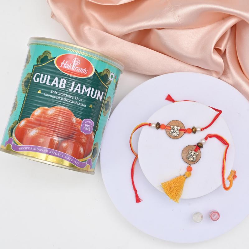 Invoke blessings and sweetness this Raksha Bandhan with our Divine Ganesha & Sweet Indulgence Rakhi Set. This auspicious pair features a beautifully crafted Ganesha Rakhi for your Bhaiya, symbolizing wisdom, prosperity, and obstacle removal. The intricate details of Lord Ganesha are designed to bring good fortune and positive energy. The accompanying Lumba for your Bhabhi mirrors this divine elegance, creating a harmonious and spiritual tribute to their bond. To make this celebration even sweeter, we''ve included a generous 1kg of delectable, melt-in-your-mouth Gulab Jamun, ensuring a truly unforgettable and joyful Raksha Bandhan for your beloved Bhaiya and Bhabhi.