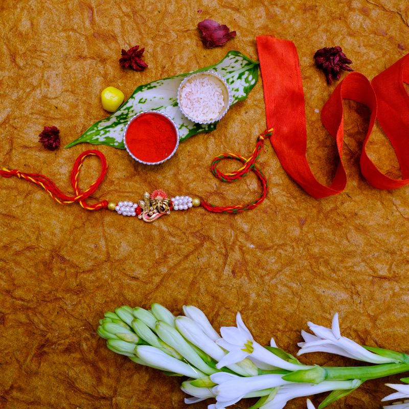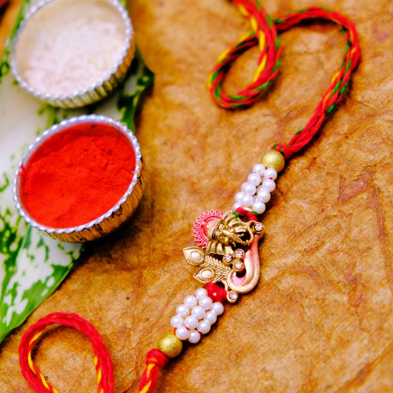 Embrace the divine with our Divine Ganesha Pearl Rakhi, blending traditional elegance with spiritual significance. Adorned with pearls and featuring a Ganesha charm, this rakhi symbolizes blessings and protection.