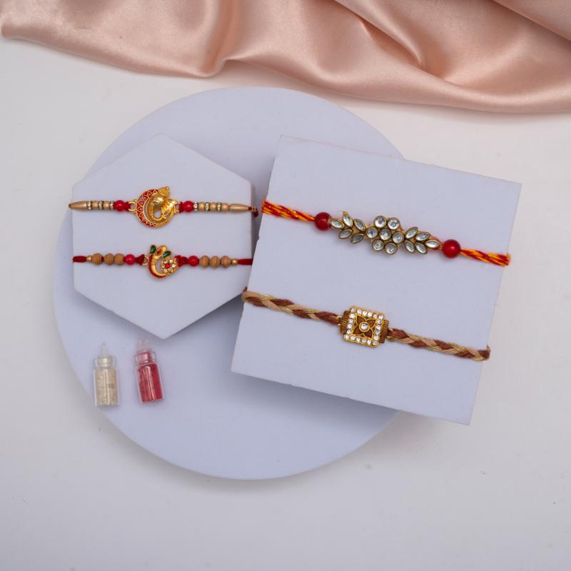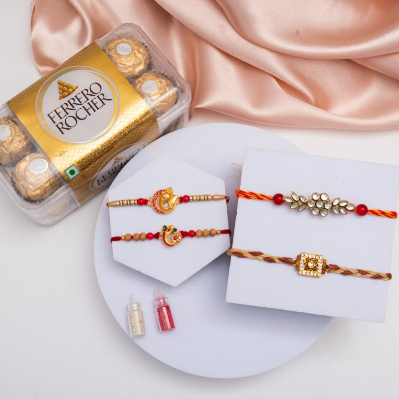 Send your love with divine blessings and refined elegance this Raksha Bandhan. This exquisite combo includes 2 sacred Ganesha rakhis, 1 intricately designed stone rakhi, and 1 sparkling American diamond rakhi—crafted to suit different personalities. Paired with a luxurious box of 12 Ferrero Rocher chocolates, this set is perfect for expressing warmth, tradition, and indulgence. Ideal for sending to the USA, it blends festive emotion with sweet golden delight in a single, heartfelt gesture.
