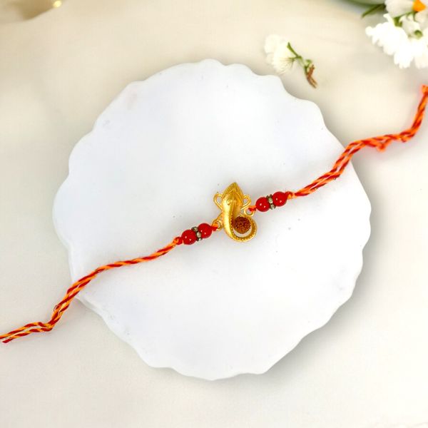 Celebrate the sacred bond of love and protection this Raksha Bandhan with our exquisite Ganesha Rudraksha Rakhi. This unique rakhi is masterfully crafted to blend spirituality and artistry, featuring a beautifully detailed idol of Lord Ganesha, revered as the remover of obstacles and the harbinger of good fortune. The natural Rudraksha beads, known for their divine properties, not only enhance the rakhi’s aesthetic appeal but are also cherished for their spiritual significance, bringing peace and harmony into the wearer’s life. Each bead carries a unique resonance, promoting tranquility and mental clarity. The intricate thread, woven with love and devotion, symbolizes the unbreakable bond between siblings, reinforcing familial ties. Gift this one-of-a-kind rakhi to your brother, and let it serve as a constant reminder of your prayers for his success and well-being, infusing his life with divine blessings and protection on this special day of celebration.