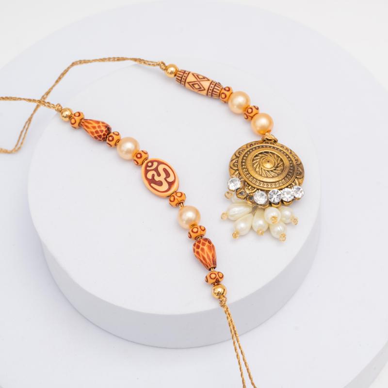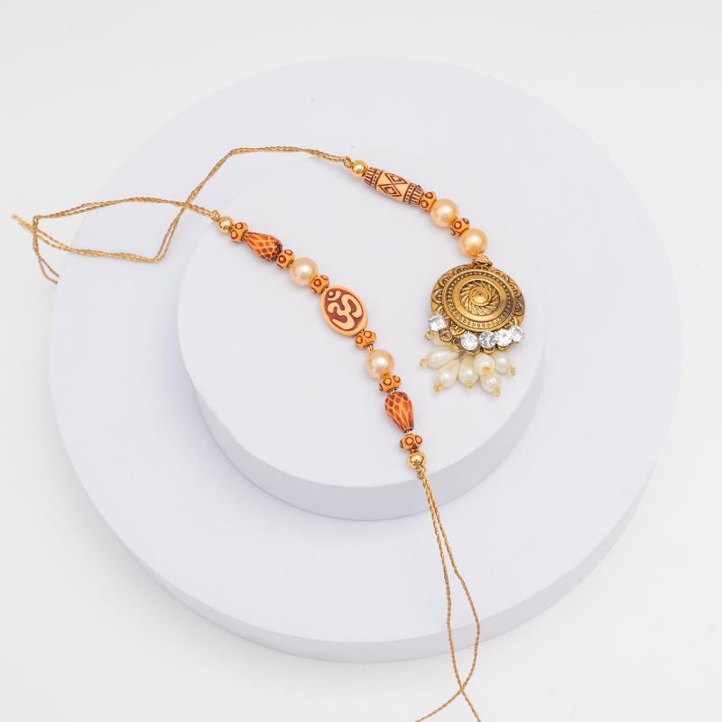 Send divine blessings wrapped in sweetness with this Om Metallic Bhaiya Bhabhi Rakhi Pair, featuring an Om-inscribed Rakhi for Bhaiya, a golden-toned Lumba for Bhabhi, and 250gms of delicious Soan Papdi. A perfect blend of tradition, elegance, and festive delight.