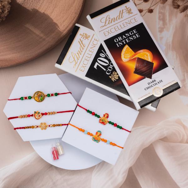 Celebrate the spiritual essence of Raksha Bandhan with this divine rakhi combo featuring 4 intricately designed Ganesha rakhis and 1 powerful Om rakhi—each symbolizing blessings, protection, and positivity. Paired with 2 luxurious Lindt Excellence chocolate bars, this set perfectly blends devotion and indulgence. Whether you''re tying the threads in person or sending love overseas, especially to the USA, this rakhi combo is an expression of heartfelt prayers wrapped in elegance and rich, gourmet delight.