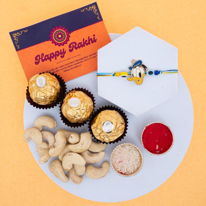 Bring home double the joy this Raksha Bandhan with a fun Donald Duck Rakhi paired with 3 pieces of Ferrero Rocher and 100g of premium almonds. Perfect for your younger sibling, this combo blends cartoon charm, rich chocolate, and healthy snacking into one thoughtful festive gift. Whether you’re near or miles apart, send your love wrapped in playfulness and sweetness.