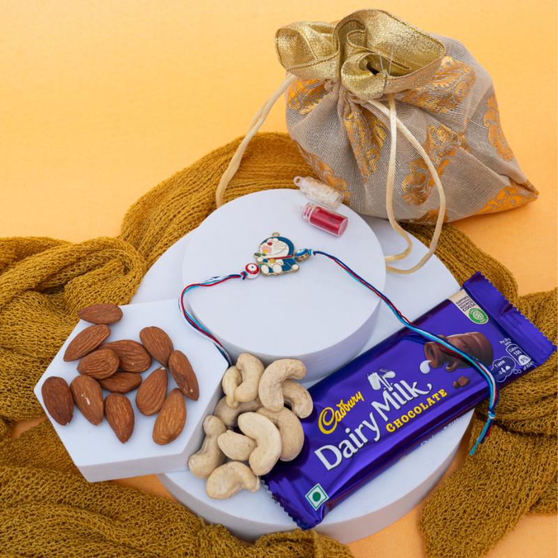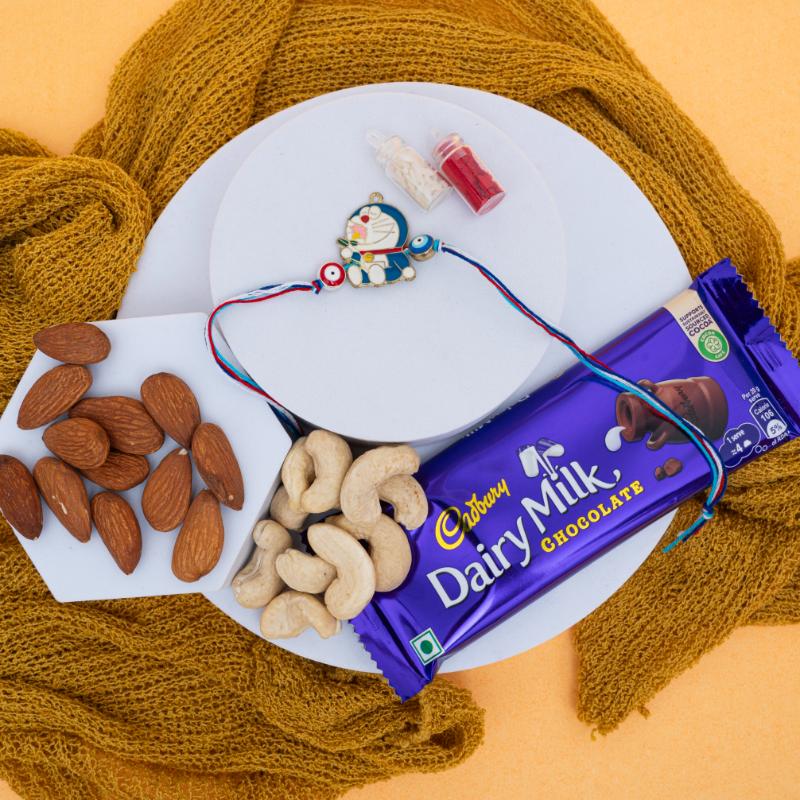 Celebrate Raksha Bandhan with a joyful mix of fun, sweetness, and health! This Doraemon Rakhi combo includes a 100g Dairy Milk chocolate bar along with 100g each of premium almonds and cashews. With a cute Doraemon rakhi that kids will love, this set blends festive spirit, tasty indulgence, and thoughtful nutrition—perfect for sending warm wishes to your little brother, even across continents.