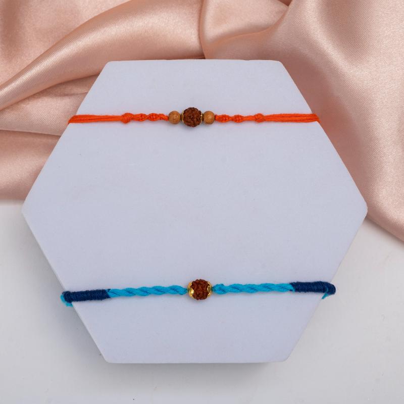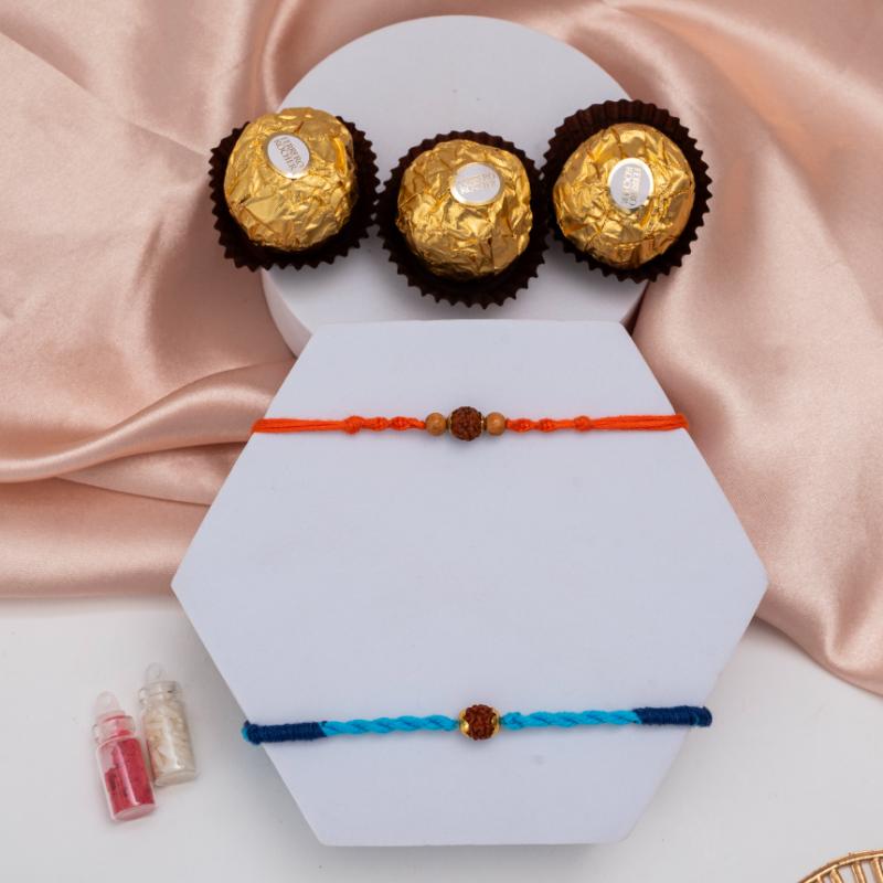 Celebrate Raksha Bandhan with a fusion of vibrant tradition and indulgent sweetness. This set features two Rudraksha mauli rakhis—one tied in energetic orange and the other in calming blue—each symbolizing strength, spirituality, and protection. Paired with 3 pieces of Ferrero Rocher chocolates, this thoughtful combo offers a perfect balance of divine blessings and delicious delight for your brother.