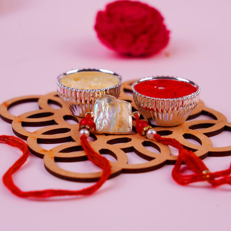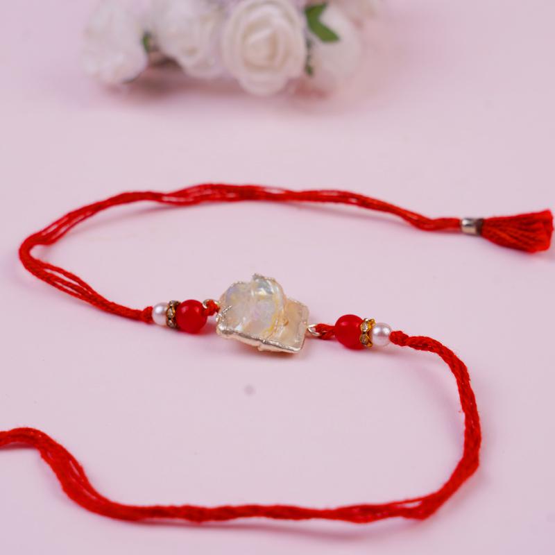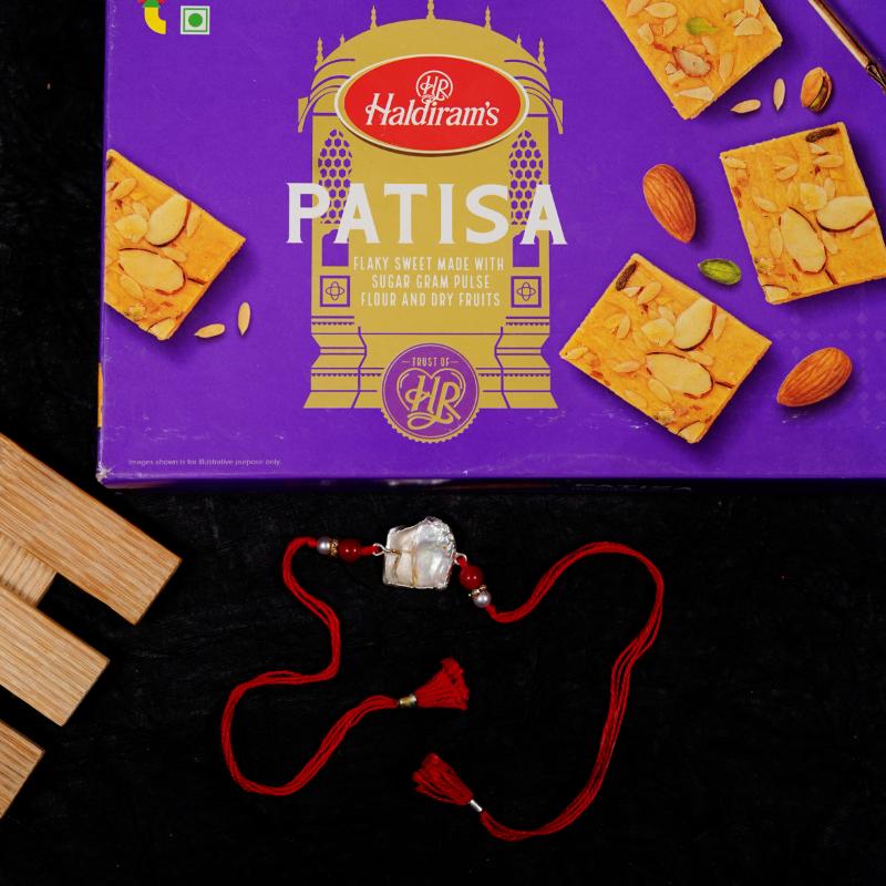Adorn your brother''s wrist with our Earthy Elegance Agate Rakhi, a truly unique and naturally beautiful piece. This distinctive rakhi features a polished, off-white agate stone at its heart, known for its grounding properties and serene beauty. It symbolizes balance, strength, and the tranquil purity of your bond, making it a thoughtful and meaningful token of your affection. This elegant rakhi comes perfectly paired with 340gms of rich, flaky Patisa, a traditional Indian sweet with a delightful melt-in-your-mouth texture, adding a touch of traditional indulgence to your heartfelt Raksha Bandhan celebrations.