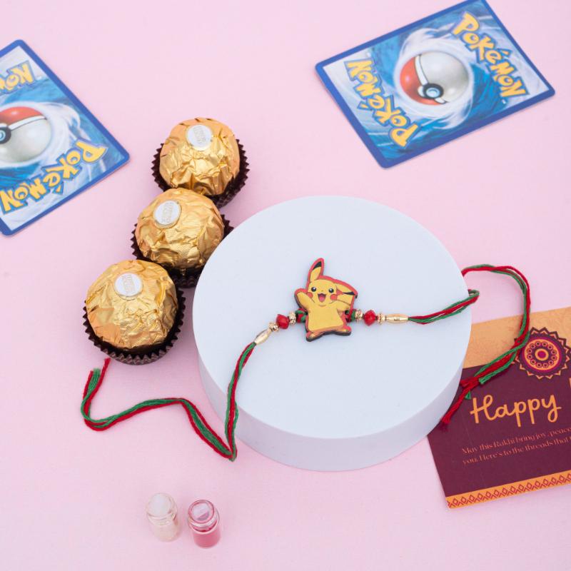 Light up your little brother’s Raksha Bandhan with our Playful Pikachu Rakhi paired with 3 pieces of Ferrero Rocher chocolates. This bright and cheerful Rakhi brings his favorite Pokémon to life while the rich chocolates add a delicious twist to the celebration—perfect for a fun-filled festive surprise.