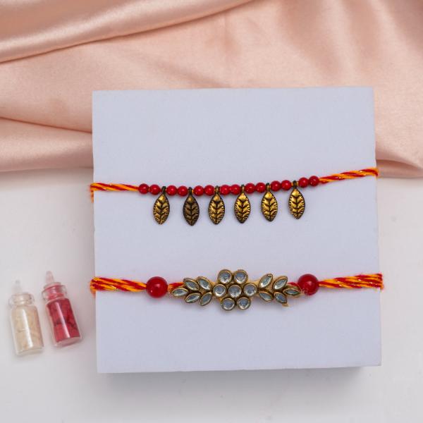 Celebrate Raksha Bandhan with this nature-inspired Elegant Stone & Leaf Motif Rakhi Set. One rakhi features a beautifully detailed stone centerpiece for a touch of sophistication, while the other showcases a graceful leaf motif symbolizing growth, protection, and harmony. Ideal for brothers who appreciate minimalist elegance and thoughtful design, this duo brings together tradition, nature, and refined style in a heartfelt festive gift.