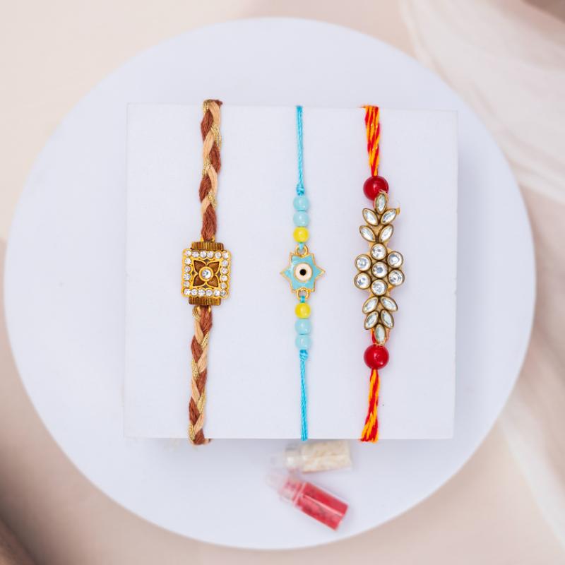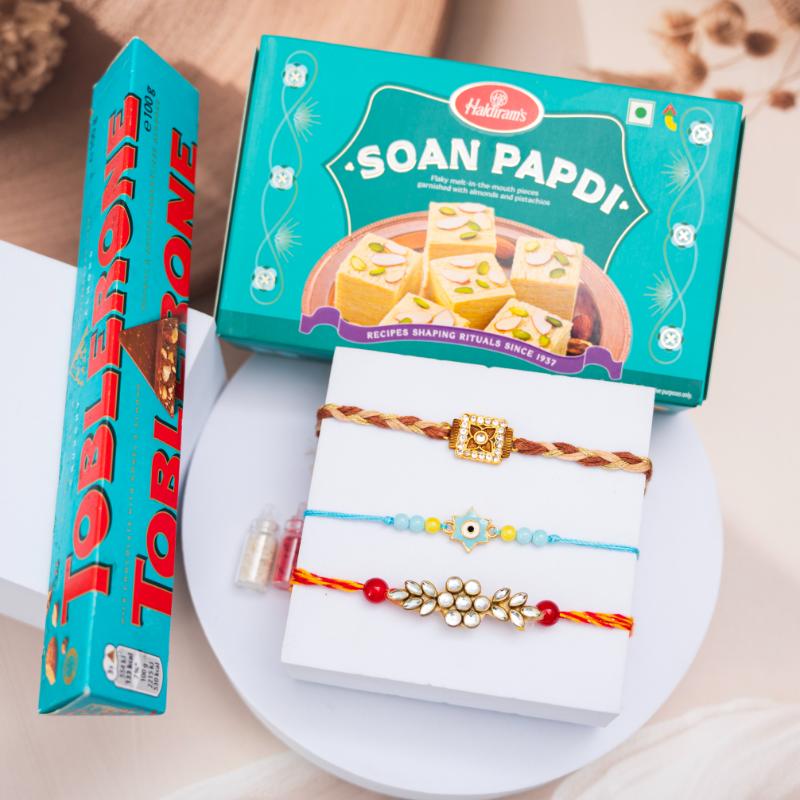 Charm, tradition, and sweetness come together in this elegant Set of 3 Rakhis. It features a sparkling American diamond rakhi, a protective blue evil eye rakhi, and a classic stone rakhi—crafted to reflect love and care. Accompanied by a 100g Toblerone chocolate bar and 250gms of flaky soan papdi, this combo blends the richness of tradition with international indulgence for your brother.