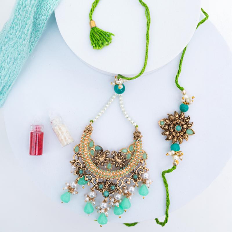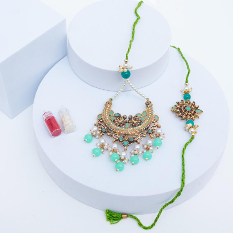 Adorn your sibling''s wrist with the serene beauty of our Emerald Bloom Bhaiya Bhabhi Rakhi set! This artistic Rakhi features captivating coral green pearls, meticulously hand-arranged to create a unique and elegant design. The refreshing green hue symbolizes growth, harmony, and new beginnings, making it a truly thoughtful gesture. Each pearl is thoughtfully selected, ensuring a Rakhi that''s as unique and precious as your bond. It''s a harmonious blend of beauty and heartfelt sentiment, making for an unforgettable Raksha Bandhan celebration.