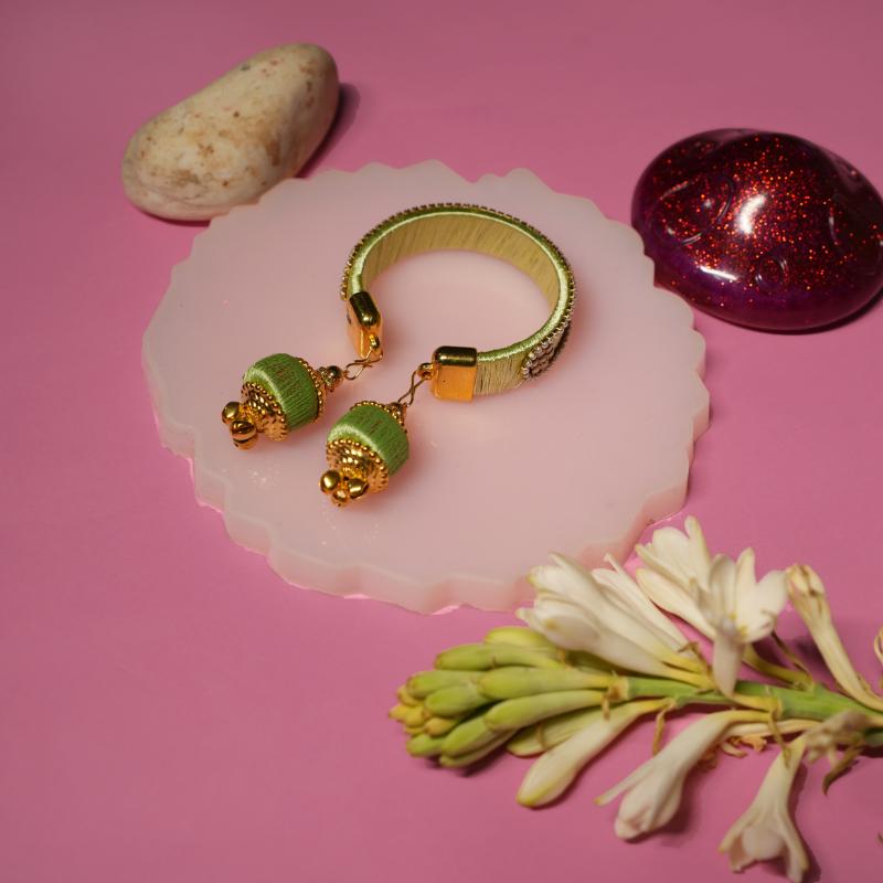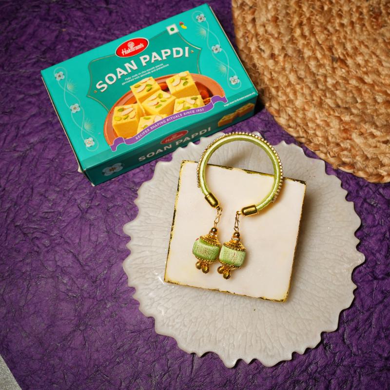Adorn your Bhabhi''s wrist this Raksha Bandhan with our Emerald Kada & Sweet Flaky Delight Lumba Rakhi. This beautiful Lumba features a vibrant green kada-style band, offering a contemporary twist to the classic Rakhi. The rich green symbolizes growth, harmony, and prosperity, ensuring it stands out beautifully on her wrist. To sweeten this thoughtful gesture, we''ve included 250gms of delicate, flaky Soan Papdi, a traditional Indian sweet that melts in your mouth. It''s a perfect blend of modern elegance and delectable indulgence, making her Raksha Bandhan truly special and memorable.