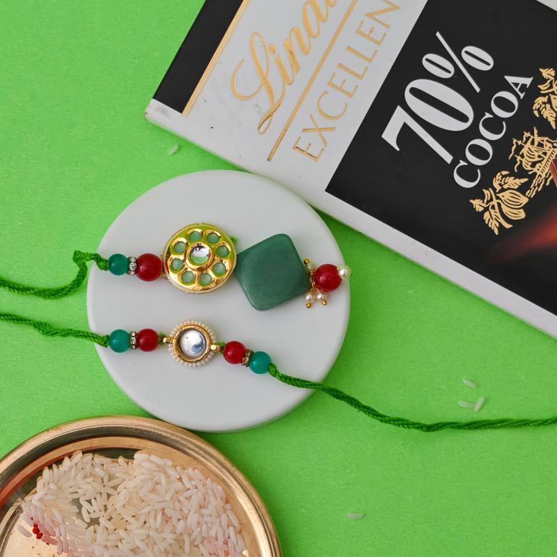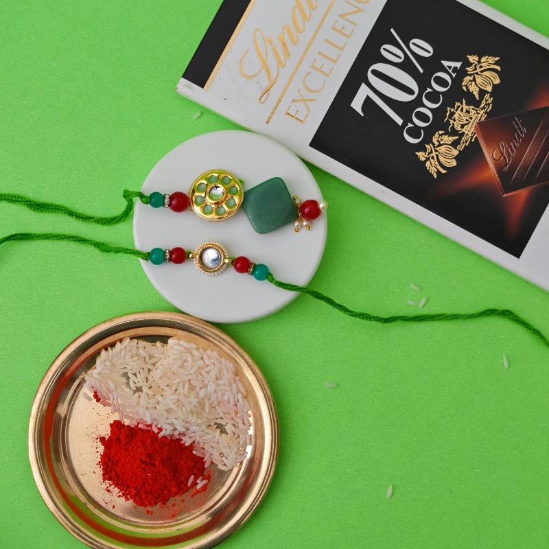 • One Bhaiya BhabCelebrate the eternal bond of siblings with our "Emerald Elegance Kundan Rakhi Duo with Lindt." This exquisite Bhaiya-Bhabhi rakhi set features intricate kundan work adorned with rich green stones, symbolizing harmony and love. Paired with a premium Lindt 70% Cocoa Chocolate Bar (100g), this rakhi combo is a perfect fusion of traditional charm and indulgent taste—ideal for gifting across borders. hi Rakhi