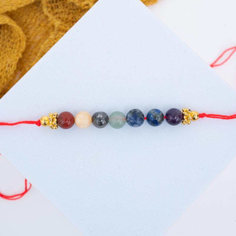 Celebrate the spirit of balance and protection with our Energizing Seven Chakras Healing Rakhi. Designed with seven natural stones, each representing a vital energy center of the body, this rakhi is both meaningful and visually striking. The colorful arrangement of crystals is tied together with soft threads that symbolize unity and love. Perfect for the brother who believes in positive energy, spiritual grounding, and inner strength—this rakhi is a thread of blessings in every sense.