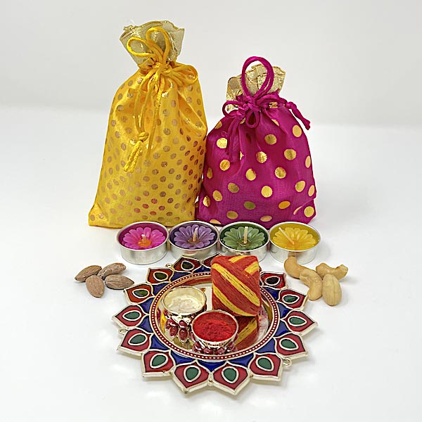 The gift pack includes: Designer Thali As In Picture 4Pcs Flower Tealight Candles Cashews 100gm Almonds 100gm 2Pcs Fancy Potli Bag Kalava and Roli Tika