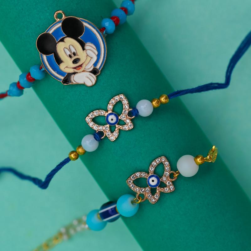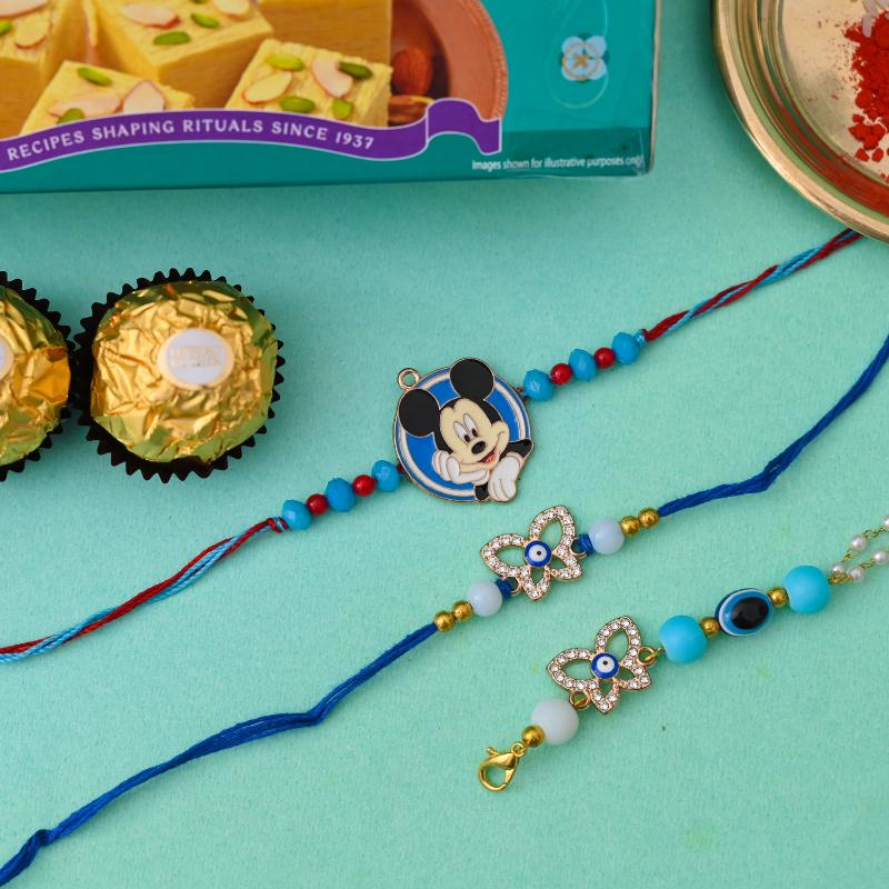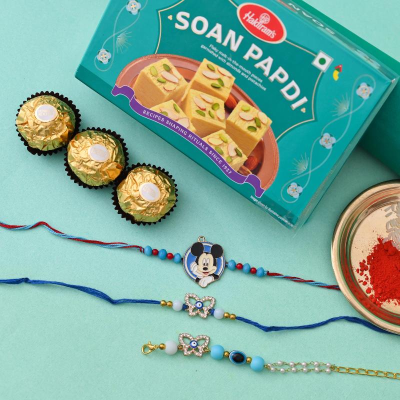 Celebrate the joy of Raksha Bandhan with our Fluttering Fun & Sweet Treasures Rakhi set! This designer combo features an enchanting butterfly-themed Bhaiya Bhabhi Rakhi pair, symbolizing grace, transformation, and enduring love. The intricate details and vibrant hues of the butterflies make this set a delightful tribute to their bond. Adding a playful touch, we''ve included an adorable Mickey Mouse Kids Rakhi, perfect for your little sibling or a cherished child in the family, bringing smiles and cartoon magic to the festivities. To sweeten this wonderful array, indulge in the delicate flakiness of Soan Papdi and the rich, nutty delight of Ferrero Rocher chocolates. It''s a truly whimsical and delicious collection, creating unforgettable memories for everyone this Raksha Bandhan.