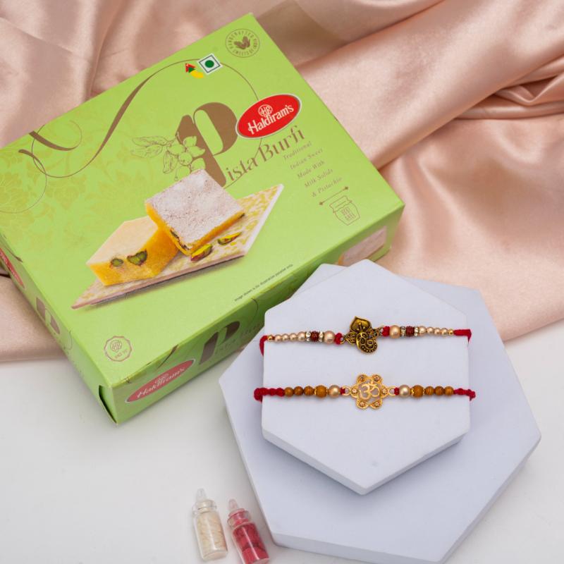 Celebrate Raksha Bandhan with a meaningful blend of tradition and taste. This combo includes two sacred rakhis—one with a beautifully designed Ganesha motif and the other with the divine Om symbol—both representing blessings, protection, and peace. Paired with 340gms of rich, flavorful pista burfi, this set brings spiritual warmth and festive sweetness to your brother’s wrist and heart.