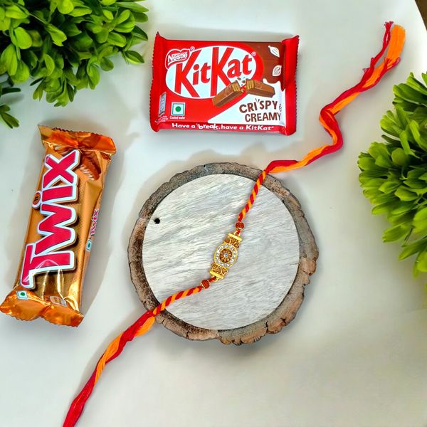 Celebrate the cherished bond of siblinghood with our exquisite Golden American Diamond Rakhi, elegantly paired with delicious treats of Twix and KitKat. This stunning rakhi features intricate craftsmanship, adorned with shimmering American diamonds that catch the light, symbolizing the sparkle of love and affection shared between brothers and sisters. The warmth of this unique design, reminiscent of timeless traditions, is complemented beautifully by the delightful combination of two beloved chocolates—Twix, with its tantalizing mix of caramel and biscuit, and KitKat, famous for its satisfying crunch. This thoughtful rakhi set transcends mere gifting; it''s a heartfelt gesture that encapsulates sweet memories and joyous moments spent together. Perfect for this auspicious occasion, it promises to make your sibling''s day extra special, blending tradition with the indulgence of delightful chocolates. Celebrate your bond in style, making this Raksha Bandhan unforgettable and filled with sweetness that lasts a lifetime!