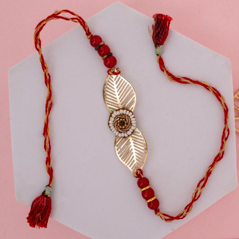 Add a touch of elegance to Raksha Bandhan with our Golden Grace Designer Leaf Rakhi. Featuring a delicately crafted golden leaf as the centerpiece, this rakhi blends contemporary charm with natural inspiration. The intricate leaf design symbolizes growth, strength, and enduring love—making it the perfect choice for a brother who appreciates beauty in the details. Tie this rakhi to express your heartfelt bond in a style that’s as timeless as nature itself.