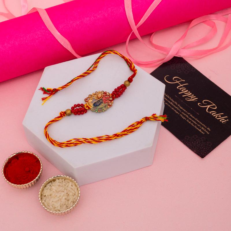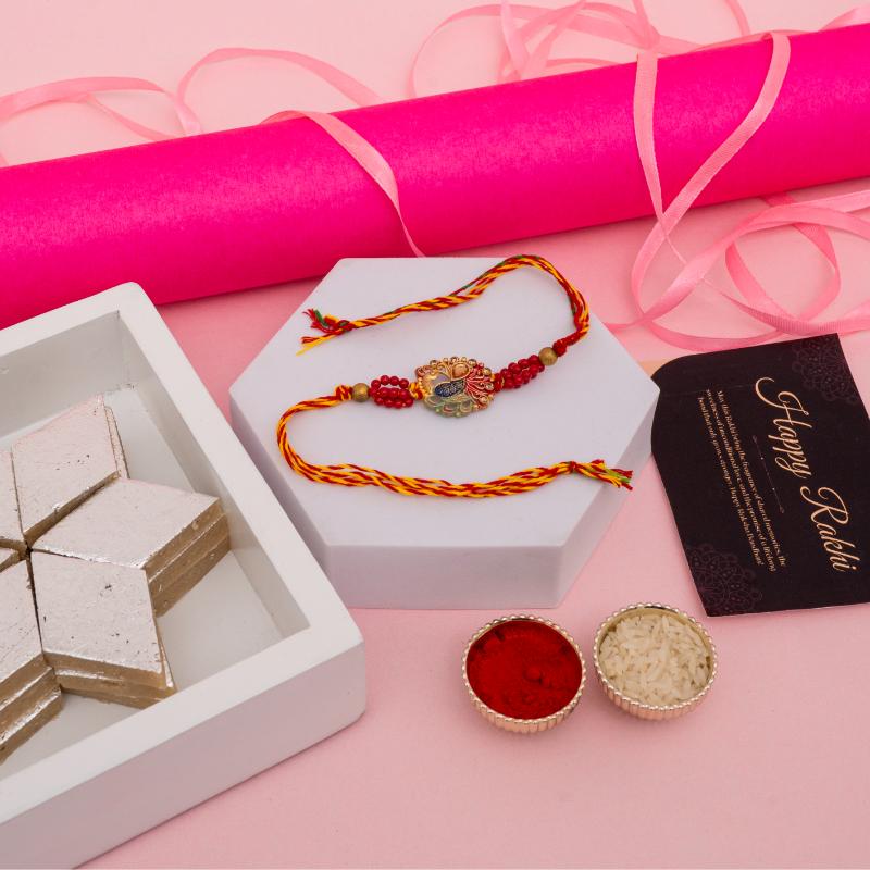 Celebrate the beauty of tradition with our Golden Peacock Rakhi with Kaju Katli 340gms. Adorned with a detailed golden peacock motif, this rakhi symbolizes grace, prosperity, and timeless sibling love. Its rich design adds festive elegance to your Raksha Bandhan celebration. Paired with 340gms of premium Kaju Katli, made from the finest cashews, this combo brings together artistic charm and sweet indulgence. A perfect gift to send across India or to your brother in the Australia.