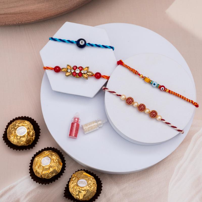 Charm your brothers this Raksha Bandhan with a set of 4 graceful rakhis, each showcasing elegance through fine threads and delicate embellishments. Paired with a trio of Ferrero Rocher chocolates, this combo blends tradition with a sweet indulgence. Whether you''re sending it across the globe or tying it in person, this curated set is perfect for expressing love, blessings, and a touch of luxury all in one heartfelt gift.