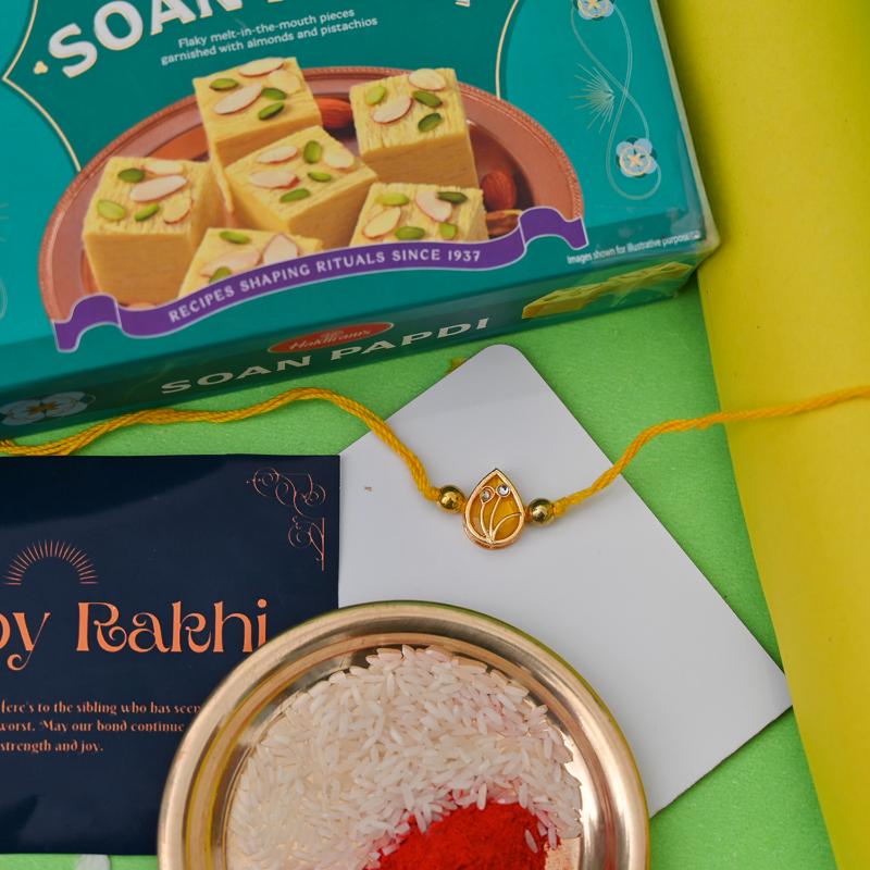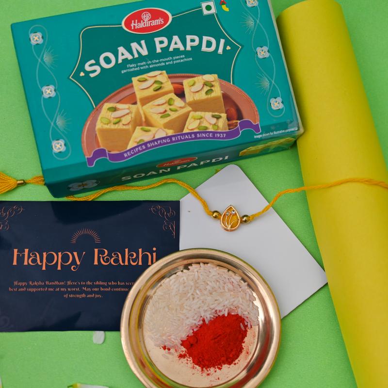 Celebrate the spiritual essence of Raksha Bandhan with this Hare Krishna Bansuri Rakhi combo. Featuring Lord Krishna’s iconic flute design, this rakhi is a symbol of love, divine protection, and peace. Tied with traditional threads, it’s perfect for expressing heartfelt blessings. Paired with 250gms of soft, flaky Soan Papdi, this set brings together sacred sentiment and classic sweetness. Whether you''re celebrating in India or sending love to the Australia, this combo offers a beautiful blend of devotion and delight.