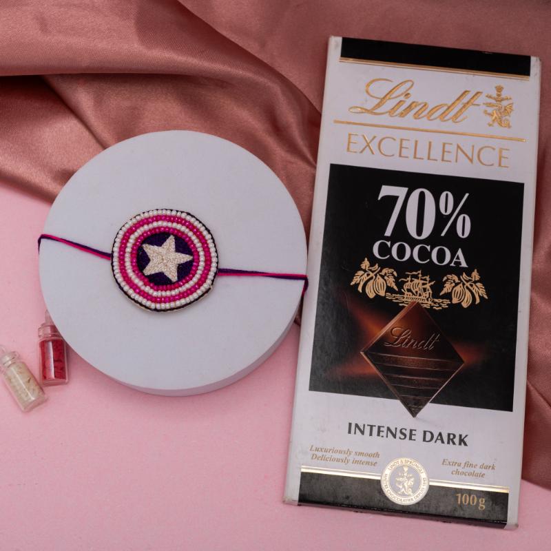 Honor your brother’s inner superhero with this Captain America Embroidered Rakhi, paired with a rich and smooth Lindt Excellence Chocolate Bar. A thoughtful Raksha Bandhan combo for the brother who’s bold, brave, and sweet at heart.