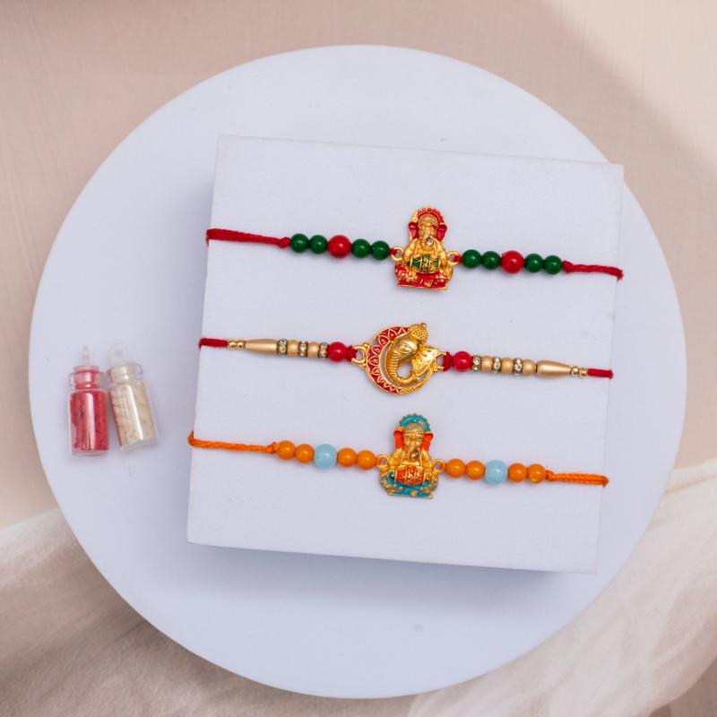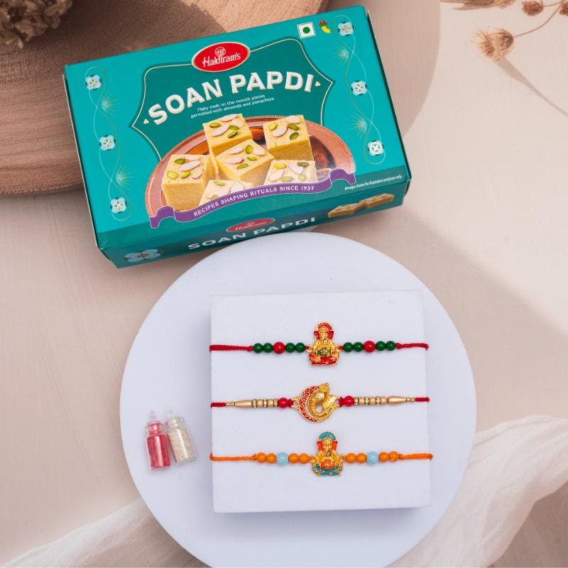 Invoke blessings and spread festive joy with this divine Set of 3 Ganesha Rakhis. Each rakhi is intricately designed with Lord Ganesha motifs, symbolizing wisdom, protection, and auspicious beginnings. Paired with 250gms of classic Indian soan papdi, this combo adds sweetness and spiritual charm to your Raksha Bandhan celebration—perfect for making your brother feel loved and cherished.