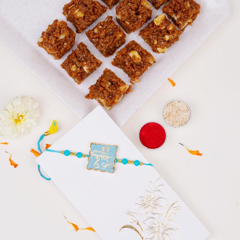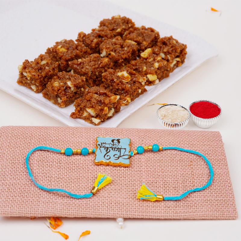 Celebrate the divine bond of Raksha Bandhan with our Krishna Rakhi with Dodha Burfi 200gm combo. Featuring an intricately crafted rakhi with Lord Krishna’s charming image, this rakhi symbolizes love, playfulness, and protection. Paired with 200gms of rich and nutty Dodha Burfi, made from caramelized milk and garnished with dry fruits, this combo is the perfect blend of devotion and indulgence. Send this heartwarming gift to your brother in India or the Australia for a meaningful Rakhi celebration.