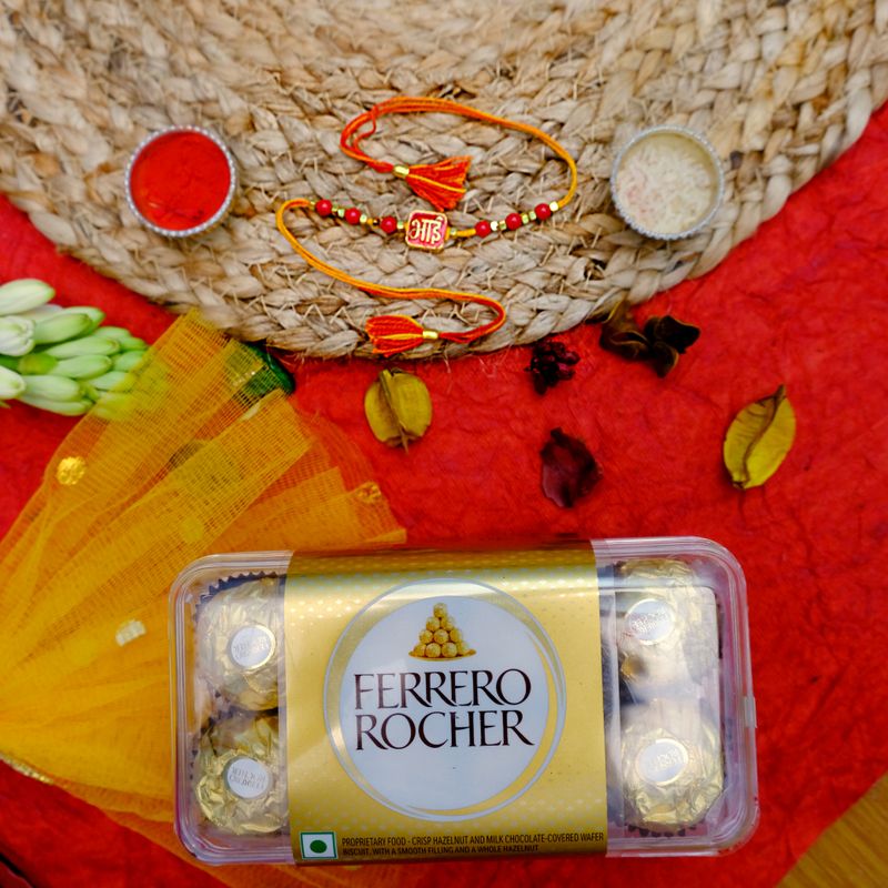 Celebrate Raksha Bandhan with our Luxe Delight Bhai Rakhi, adorned with intricate designs and paired with 12 indulgent Ferrero Rocher chocolates. Perfect for expressing your love and affection in a truly luxurious manner.