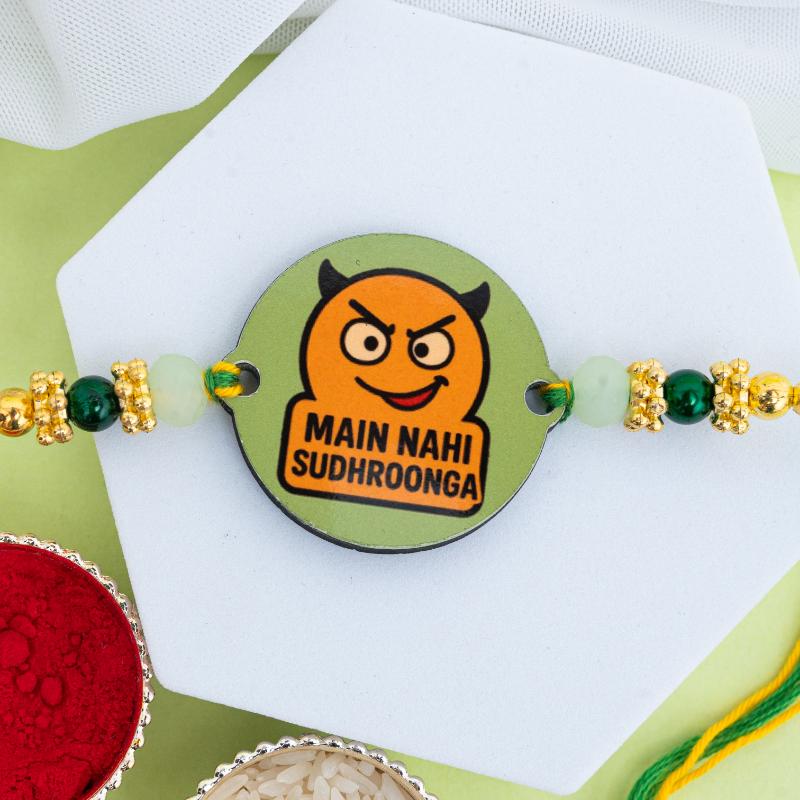 For the brother who proudly owns his mischief, the Mai Nahi Sudharoonga Rakhi is the perfect match! With its cheeky message and fun design, this rakhi is made for the bhai who keeps you laughing, teasing, and rolling your eyes. Crafted with love and humor, it’s your way of saying, “I accept you, tantrums and all!”—even from across the globe.