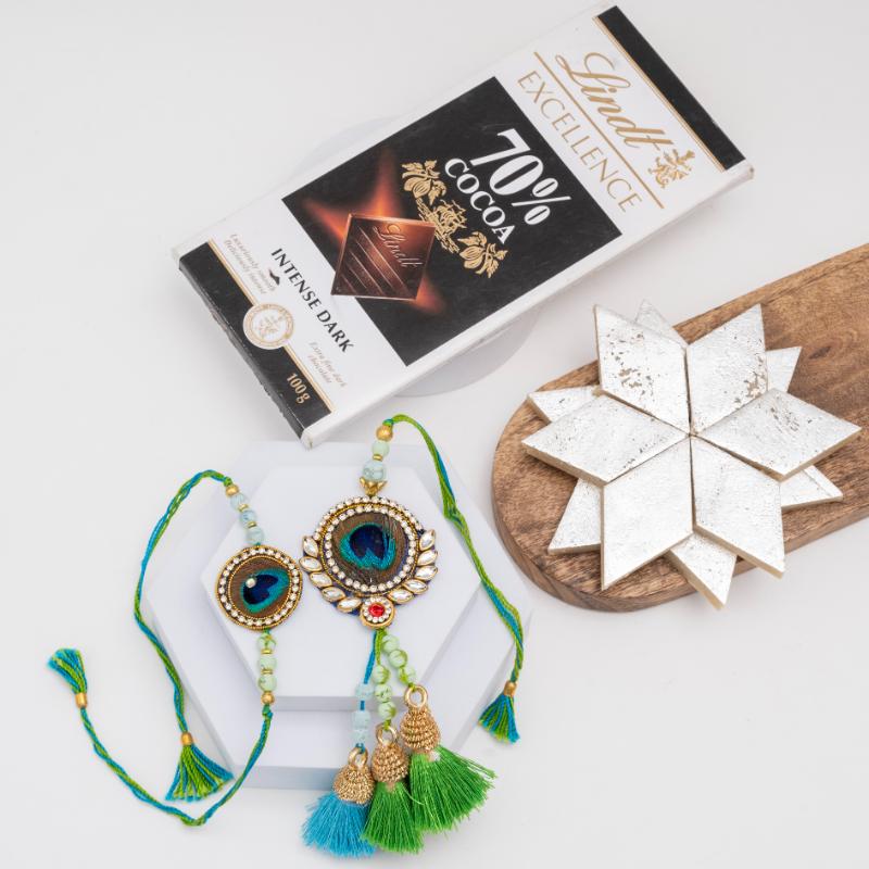 Adorn your beloved Bhaiya and Bhabhi with our Majestic Peacock & Dual Delight Rakhi set this Raksha Bandhan. This exquisite pair features intricately designed peacock motifs, symbolizing beauty, grace, and eternal love, adorning both the Bhaiya Rakhi and the matching Lumba for Bhabhi. The vibrant hues and delicate craftsmanship capture the essence of this magnificent bird, making it a truly unique and eye-catching tribute to their bond. To sweeten their celebration, we’ve included 200gms of rich, traditional Kaju Katli alongside a luxurious Lindt Excellence 100gms chocolate bar for a perfect blend of Indian sweetness and gourmet indulgence. It’s a regal offering that combines artistic beauty with delightful treats, ensuring an unforgettable occasion.