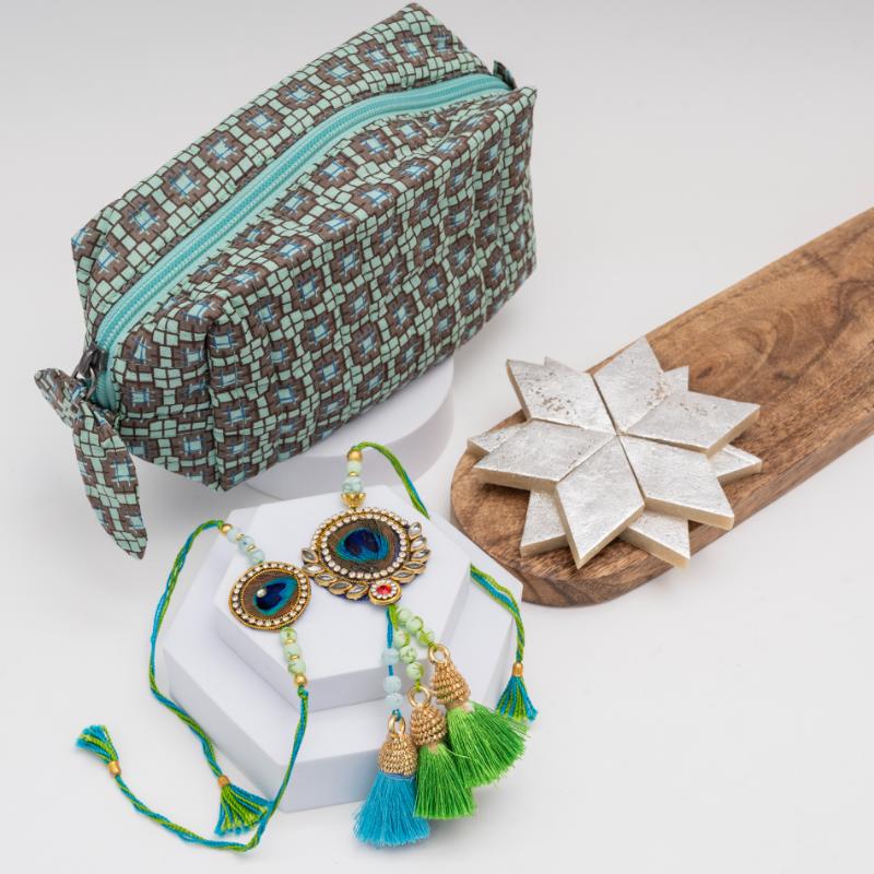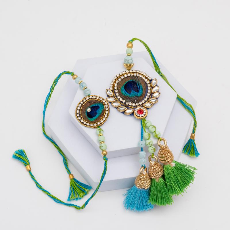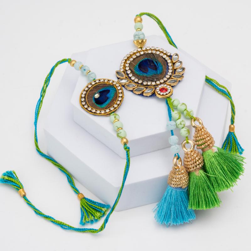 Adorn your beloved Bhaiya and Bhabhi this Raksha Bandhan with our Majestic Peacock & Sweet Journey Rakhi Set. This exquisite pair features intricately designed peacock motifs, symbolizing beauty, grace, and eternal love, adorning both the Bhaiya Rakhi and the matching Lumba for Bhabhi. The vibrant hues and delicate craftsmanship capture the essence of this magnificent bird, making it a truly unique and eye-catching tribute to their bond. To sweeten their celebration, we’ve included 200gms of rich, traditional Kaju Katli. And to add a thoughtful touch, each set comes with a chic travel pouch, perfect for keeping their cherished Rakhi safe or for storing small essentials on their next adventure. It’s a regal offering that combines artistic beauty with delightful treats and practical elegance, ensuring an unforgettable occasion.
